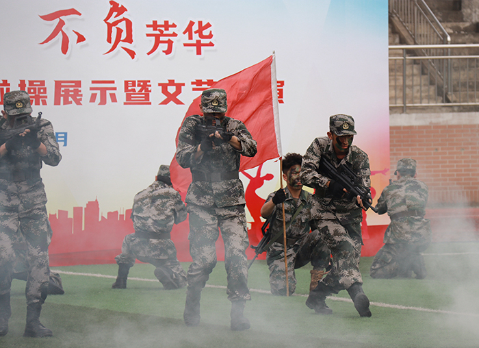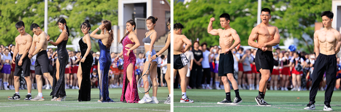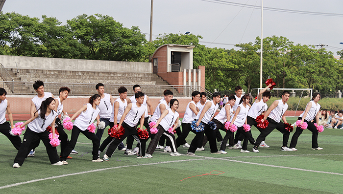 啦啦操展示期间,军博社带来青春热血的《战魂》表演,校艺术团的学生们热情演唱《猪猪侠》,并带来诗朗诵《书写青春华章》,无不展现出青春的活力与热情。校健美队带来的《青春飞扬 秀出精彩》健身健美表演展现了力量与美的完美结合,青春少男少女们矫健身姿和健康的体魄赢得全场的欢呼。最后,人文与教育学院用舞蹈《穿越时空的对话》通过当代青年与过去革命先辈的思想交流与情感碰撞,展现了不同年代的青年对于信仰、理想、追求的感受。