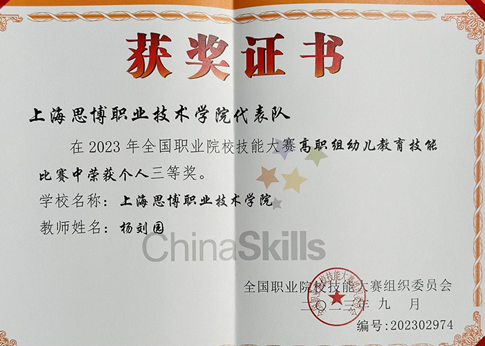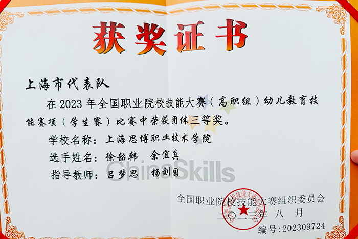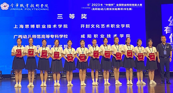 2023年“中银杯”全国职业院校技能大赛(高职组)幼儿教育技能赛项中,我校教育学院师生分别参加了学生赛道和教师赛道的激烈角逐。最终,在8月19日到22日举办的幼儿教育技能赛项(学生赛)中,由教育学院教师吕梦思、杨刘园指导的21级徐韶韩、21级余宜真组成的学生团队荣获国赛三等奖,我校也是全国唯一获奖民办高校;9月1日到2日举办的幼儿教育技能赛项(教师赛)中,教育学院教师杨刘园荣获教师组三等奖。