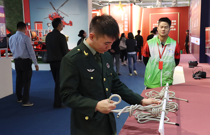 在参观过程中,同学们还被沙盘模型、军事装备模型、航海船舶模型、救援设备等陈列实物吸引,并尝试学打消防绳结、聆听消防安全讲座、参与国防知识答题等活动,在互动与体验中学习公共安全和救援知识。准备参军入伍的刘子旭同学说到:“在体验区里,我深刻体验到了119电话背后消防员的辛苦以及危险,但是还想成为一名军人,为祖国的国防贡献出一份绵薄之力。”退役士兵刁荣彬同学表示:通过此次实践,我接受了一次生动的爱国主义教育,感受了先辈们在革命时期的先锋模范精神。而我作为一名退伍士兵,要严格要求自己,学习文化和军事技术,做到思想和意志都不松懈。