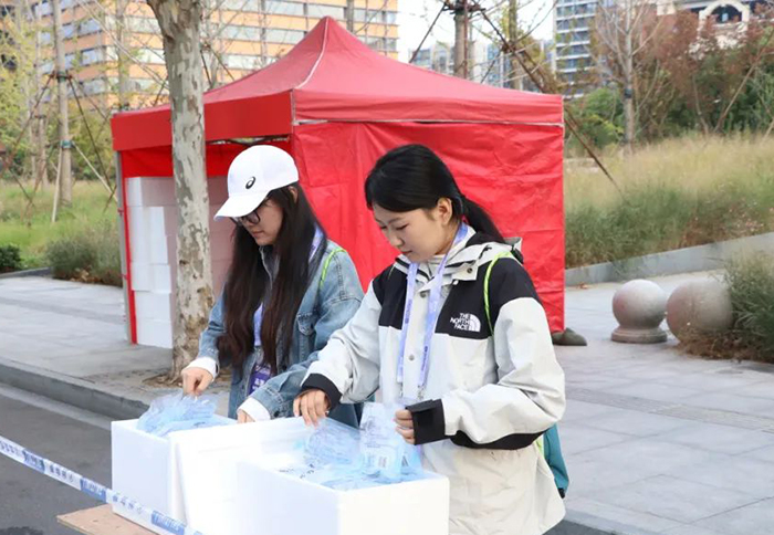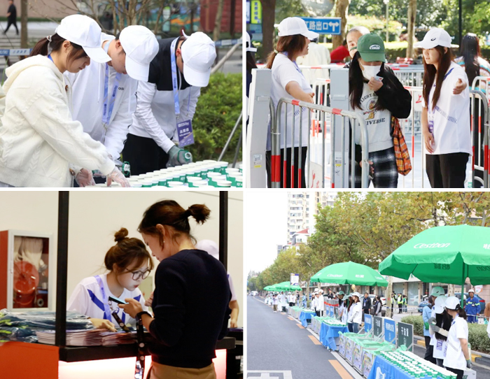 凌晨3:00,志愿者们已经整装待发,前往上海10公里精英赛的场地进行赛前准备。到达比赛现场后,同学们按照事先确定好的分工迅速投入到各自岗位中。他们分布在起终点、全程各补给站、检查岗、医疗站等赛事沿线岗位上,为跑友们提供赛场赛道指引、饮水食品补给等服务。每位同学都在各自岗位上一丝不苟、热情真诚地默默服务着。