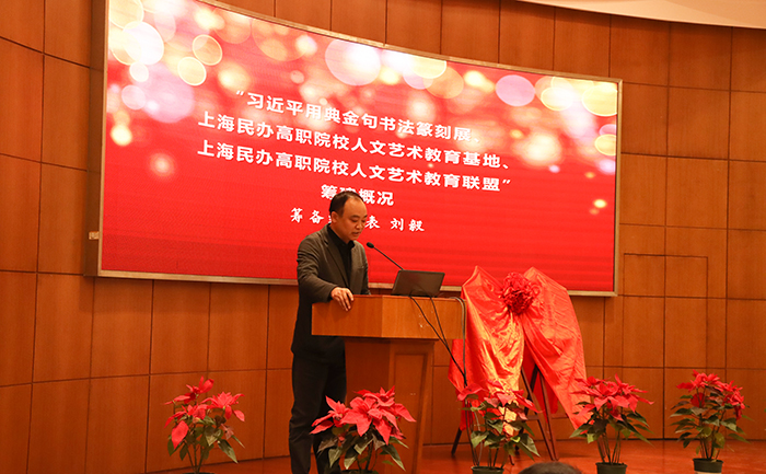 11月10日,“习近平用典金句书法篆刻展开幕式暨上海民办高职院校人文艺术教育基地、上海民办高职院校人文艺术教育联盟”成立揭牌仪式在我校学术报告厅举行。