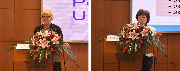 副校长兼卫生技术与护理学院院长沈小平主持第一场报告。芬兰坦佩雷大学护理与健康学院院长Dr. Marja Kaunonen教授以《芬兰的高等护理教育与课程体系-以坦佩雷大学为例》为题,分享了芬兰在高等护理教育领域的独特经验。上海交通大学学报医学版编辑部主任章雅青教授则围绕《线上一流课程建设与共享》展开了深入探讨。