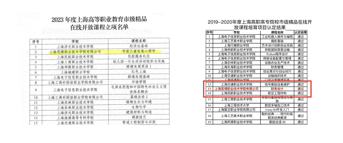 近日,上海市教育委员会公布了2023年度上海高等职业教育市级精品在线开放课程立项名单和2019-2020年度上海高职高专院校市级精品在线开放课程培育项目认定结果,我校《学前儿童发展心理学》课程获立项,2020年度市级精品在线开放课培育项目《财务会计》课程通过验收,获上海市精品开放课程。