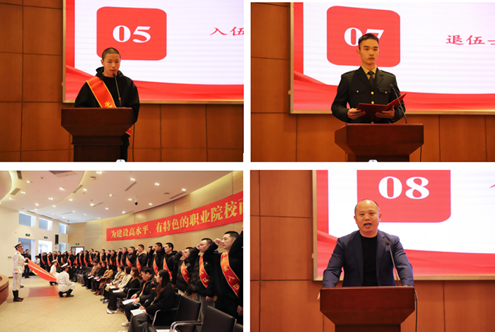 在鲜艳的国旗下,34名入伍学生庄严宣誓:“服从中国共产党的领导,全心全意为人民服务……绝不叛离部队,誓死保卫祖国!”用铮铮誓言表达了甘于将青春献给祖国、献给人民的决心和信念。入伍新兵代表顾硕凡作为预备党员,表示到达部队后,一定把“吃苦在前,甘愿奉献”的思想牢牢扎根,用实际行动践行誓言;退伍士兵陶翰宇用自己的经历告诉新兵,部队是学习技能和建功立业的平台,要培养适应和应变能力;新兵张正航的家长说到:“自己也是一名退伍老兵,作为孩子的家属,要做好孩子的后盾,鼓励和支持孩子在部队好好工作,扎根军营,保家卫国。”