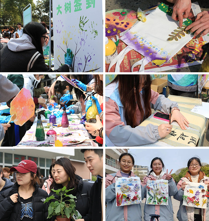 此外,活动现场还设置了丰富多彩的体验互动环节。同学们纷纷为为生命树画上自己的手印叶子,留下独特的印记,并签到打卡,获取游戏积分,兑换相应的礼品;在空白帆布袋上,用五彩颜料绘制春天的印记,留下美好的回忆;在扇面上,喷洒各色颜料,摆放各式叶子,制作出别具一格的植物喷画扇子。书法社的同学们更是挥毫泼墨,书写充满诗意的对联,将春天的诗意与植树节的意义巧妙融合,让中华文化的魅力在活动中熠熠生辉。