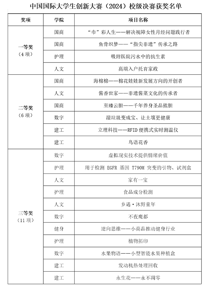 经过评委评分、集体和议认定一致,最终评出本次创新大赛校级决赛的一等奖4项、二等奖6项、三等奖11项。