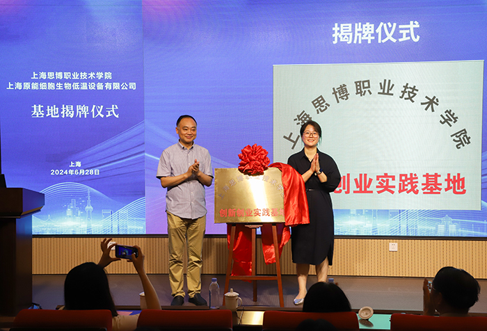 揭牌环节,杨卉卉总监分别与张学龙副校长、刘毅院长和吕梦思副院长为“上海原能细胞生物低温设备有限公司人才培养基地”“上海思博职业技术学院人才培养社会实践基地”“上海思博职业技术学院创新创业实践基地”揭牌。
