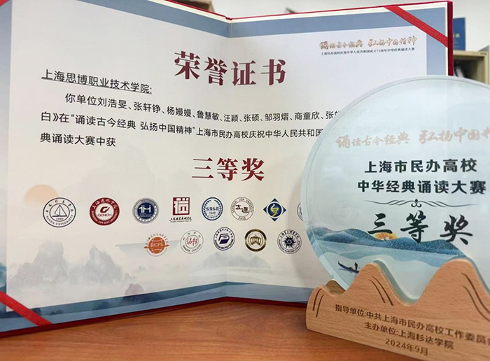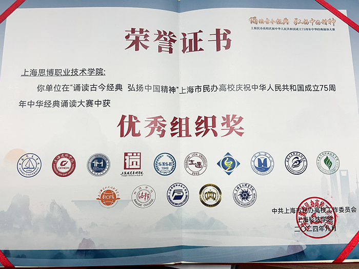 为深入学习贯彻党的二十大精神,热烈庆祝中华人民共和国成立75 周年,团结凝聚广大青年学子听党话、跟党走。在中共上海市民办高校工作委员会指导下,9月25日“诵读古今经典,弘扬中国精神”上海市民办高校中华经典诵读大赛在上海杉达学院顺利举行,我校学子凭借出色表现获得了三等奖和优秀组织奖的好成绩。