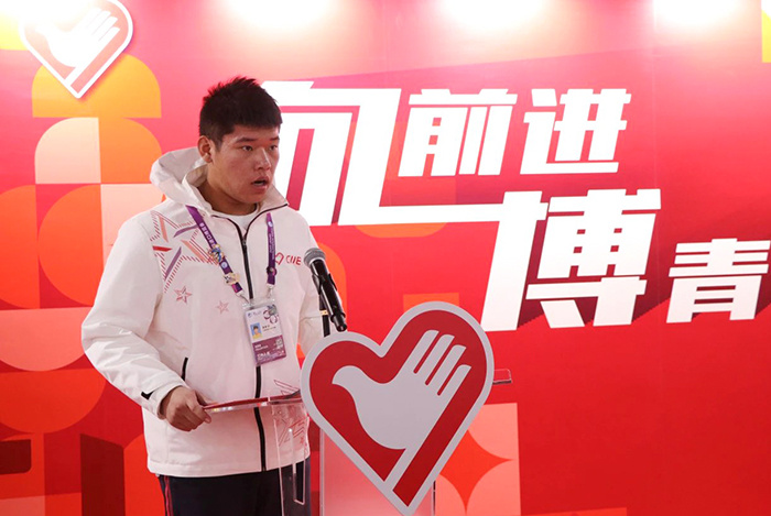 退伍士兵“小叶子”李奔檬同学作为志愿者代表发言。他表示将与其他志愿者一起在工作岗位中不断强化责任意识,在进博“大舞台”上发光发热,圆满完成工作任务。