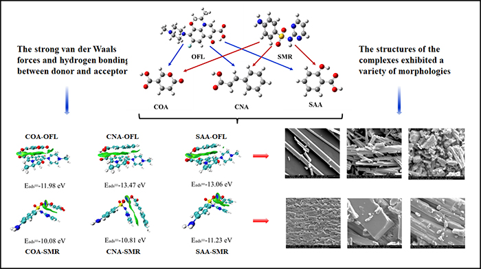研究论文以氧氟沙星(OFL)和磺胺丙嗪(SMR)为电子供体,香豆酸(COA)、肉桂酸(CNA)和水杨酸(SAA)为电子受体,合成了6种新的电荷转移配合物。通过光谱分析和DFT计算相结合,研究了这些配合物的结构表征和分子间反应机理。实验利用紫外-可见光谱在200-400 nm的最大波长宽吸收带中确定了甲醇中配合物的形成。用分光光度滴定法测定电荷转移配合物的分子组成,结果为1:1(供体:受体)。这些配合物通过红外(FTIR)和扫描电子显微镜(SEM)进行了表征。在FTIR光谱中,CT配合物与反应物相比表现出波长偏移。通过扫描电镜,复合物表现出各种形态,包括球形粒子、短棒和扁平形状。此外,在DFT/B3LYP理论水平上的量子化学计算研究了配合物的稳态结构、能量和电荷密度。分子间结合能为负,表明六种配合物的反应是自发进行的. 供体与受体之间存在较强的范德华力和氢键,使配合物具有较强的分子稳定性。供体分子中的C-N和N-H基团以及受体分子中的-羧基基团在络合过程中起着关键作用。DFT的计算结果适合支持我们的实验结果。本研究强调了供体和受体在电荷转移相互作用中的分子机制,为抗生素复合物的合成和抗生素的去除提供了理论基础。