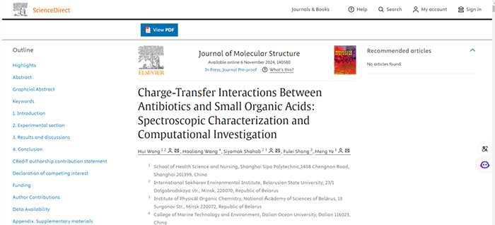 近日,我校卫生技术与护理学院基础医学教研室主任王辉副教授圆满完成国家留学基金委公派访问学者项目第一期访学任务,并以第一作者身份、叶萌副教授为共同通讯作者,以上海思博职业技术学院为第一单位在《Journal of Molecular Structure》(JCRQ1区)期刊上发表了研究论文"Charge-Transfer Interactions Between Antibiotics and Small Organic Acids: Spectroscopic Characterization and Computational Investigation "。王辉副教授的国家留学基金公派访问学者项目是在学校和上海市教委的推荐下获批,也是上海民办高校首个获资助的项目。