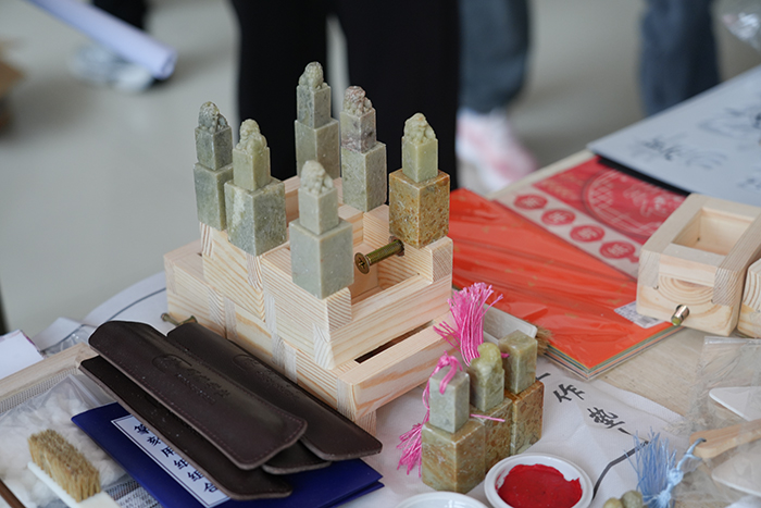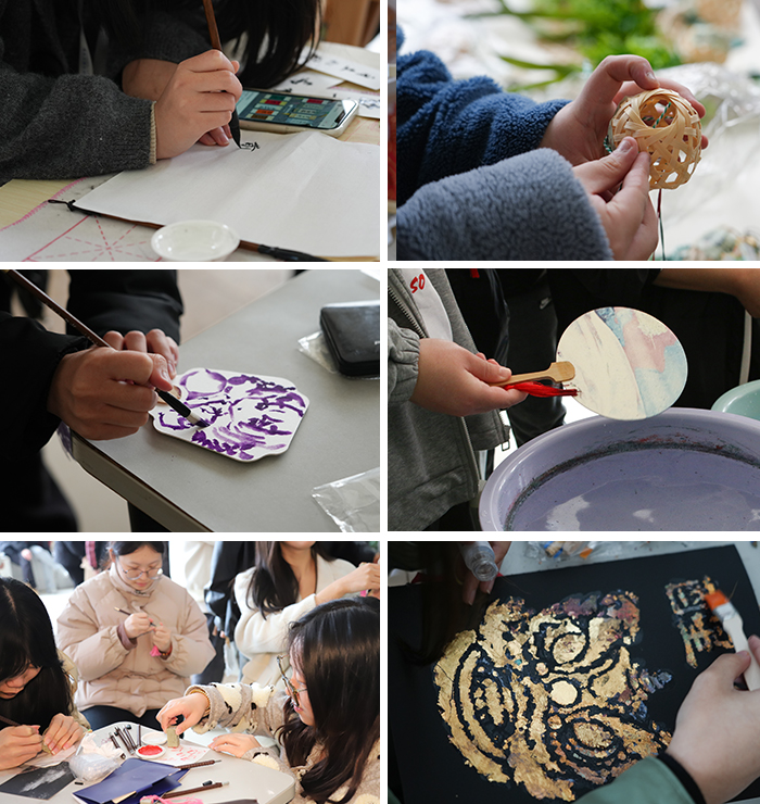 同学们兴致满满,体验金石篆刻的独特技艺,感受传统文化在方寸之间的精妙呈现;剪刀在红纸上灵动穿梭,一幅幅精美的剪纸作品跃然而出;糖画以糖为墨,绘制出各种栩栩如生的形象;竹编活动的巧手编织;水拓漆染、扎染充满了创意与惊喜。充满乐趣的手工体验,引得同学们纷纷驻足参与,动手制作出心仪的作品。在创作过程中,学生们施展了创意与才华充分体现了新一代对传统文化的传承与创新精神。通过实践,他们不仅掌握了传统技艺的制作方法,更深刻领悟了这些技艺背后深厚的文化底蕴。