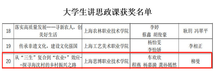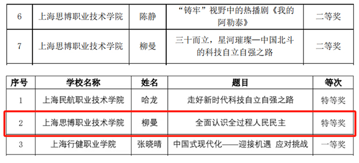 此外,在“2024年上海市高职高专思政课教案设计比赛”中,柳曼老师荣获特等奖;在“2024年上海市高职高专思政课教学案例设计比赛”中,陈静老师和柳曼老师荣获二等奖。