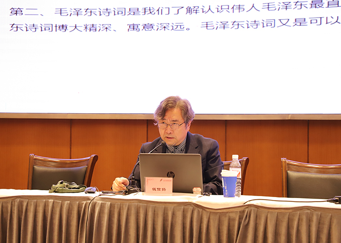 在专题讲座中,钱佐扬先生以深厚的学术积淀和生动的艺术表达,引领师生走进毛泽东诗词的壮阔世界。他以“毛泽东诗词是毛泽东思想的重要组成部分”为切入点,系统阐述了毛泽东诗词在哲学思想、历史镜像与革命精神中的独特价值;以《西江月·井冈山》、《十六字令(三首)》等作品为例,生动剖析了毛泽东诗词中“形格峻整、字格雄拔、韵格飞扬”的艺术特色;以《渔家傲·反第一次大“围剿”》中“前头捉了张辉瓒”的战役纪实,《水调歌头·重上井冈山》中“可上九天揽月”的豪情壮志,串联起中国共产党领导下的重大历史事件,让师生们深刻感受到毛泽东诗词与民族命运的血脉相连。最后,他分享了诗词背后的创作故事,如《沁园春·雪》在重庆谈判期间引发的轰动,以及《卜算子·咏梅》在三年困难时期鼓舞人心的时代意义,令在场师生深受感动,为之动容。