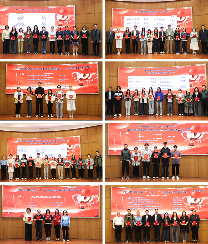 颁奖环节,主持人依次宣读了各奖项获奖名单,与会领导分别为“借阅之星”(教师组、学生组)、“书香校园・经典诵读”打卡获奖者、“捐书之星”、“哪吒同行・阅动三界”阅读积分挑战赛获奖者、“穿梭名著长廊・感悟多彩世界”短视频讲座打卡获奖者以及第十届“知网杯”上海高校信息资源发现大赛获奖者颁发荣誉证书与奖品。