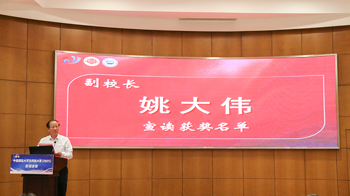 姚大伟副校长宣读获奖名单。现场气氛热烈,掌声雷动。获奖团队代表依次上台领奖,与会领导为他们颁发荣誉证书,并与他们合影留念,共同记录这一荣耀时刻。