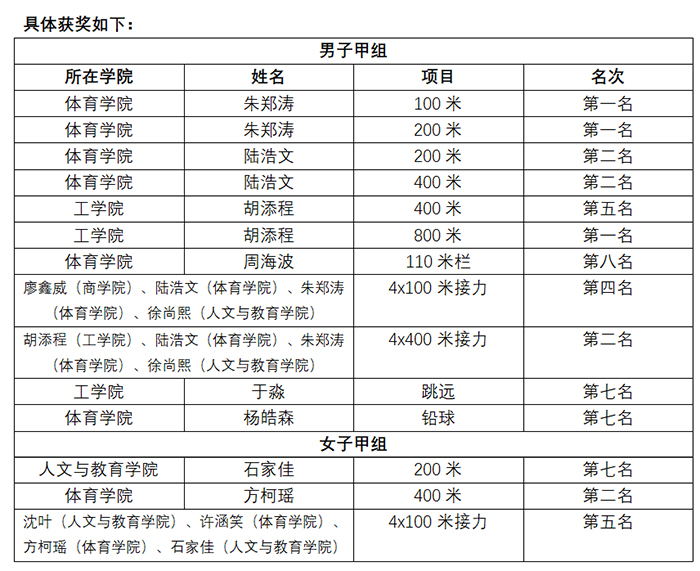 本次比赛由上海市教育委员会主办,上海市大学生体育协会、上海市校园田径联盟承办。自上次大学生田径比赛以来,上海市各高校的竞赛项目水平取得了显著提升。从参赛对手的实力到各项成绩的刷新,都充分证明了此次田径比赛是近年来极具挑战性和竞争性的一届。我校田径队凭借出色的体能储备和较高的竞技水平,克服天气、伤病等困难,以汗水和坚持诠释了体育精神的真谛,为学校争得了荣耀。