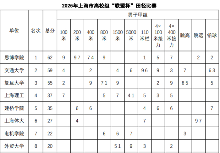 在刚刚结束的2025年上海市大学生田径“联盟杯”赛中,在体育学院于杰老师的带领下,我校田径队历经两天激烈角逐,与来自沪上的36所高校的600余名选手同场竞技,最终斩获3枚金牌、4 枚银牌,共获得14项前八名奖项,以62分的总成绩力压上海交通大学、复旦大学等诸多院校,获得男子甲组团体第一名的好成绩。