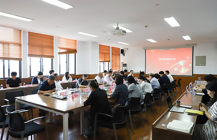 为深入了解商学院发展需求,推动学校教学改革与内涵式发展,6月12日上午,校领导万峰、黄正、冯渊、谢敏率相关职能部门负责人对商学院开展专题调研,并召开现场办公会。副校长兼商学院院长姚大伟、常务副院长朱惠茹、副院长于丽艳、胡凤麟、金波、教研室主任及相关人员参加会议。