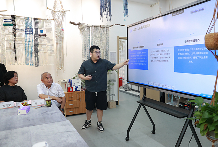 项目负责人王赟老师汇报了项目阶段性建设成果。他指出,项目实施以来,通过科学布局多层次专业竞赛体系,在多项市级及以上职业技能赛事中取得突破性成就。创新构建的中高职贯通培养机制,有效打通职业教育纵向衔接通道;深化跨院校联合培养模式,在全国性专业赛事中斩获重要奖项,验证了协同育人机制的有效性;学生团队在各类竞赛中的卓越表现,充分彰显了实战能力培育体系的显著成效。这些成果为破解职业教育“重理论轻实践”的痛点提供了可供参考的解决方案。