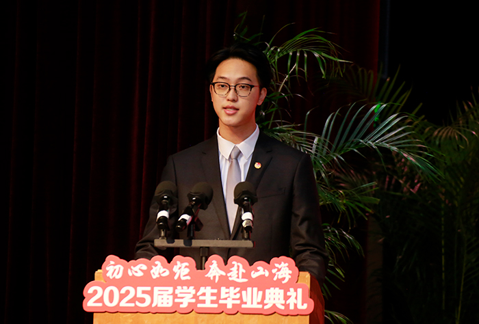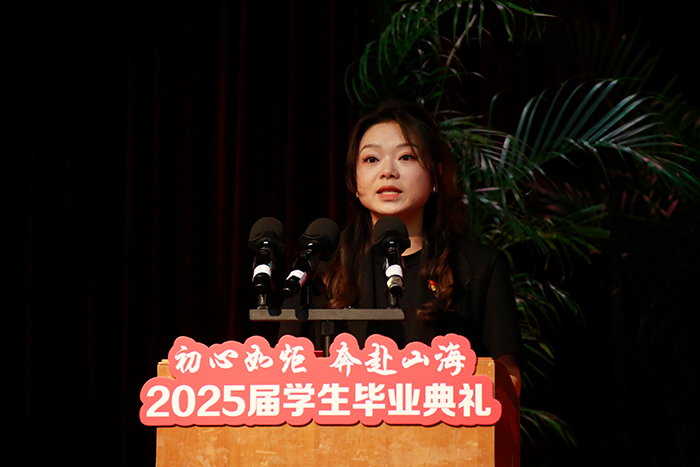 毕业生代表、外国语言文化学院方林以“繁花有时,生根有时”为喻,分享其斩获市级双创大赛金、银奖、担任中华艺术宫双语讲解员等成长经历,号召同学们在大数据与人工智能时代,以奋斗姿态投身强国建设。