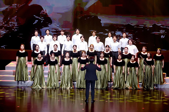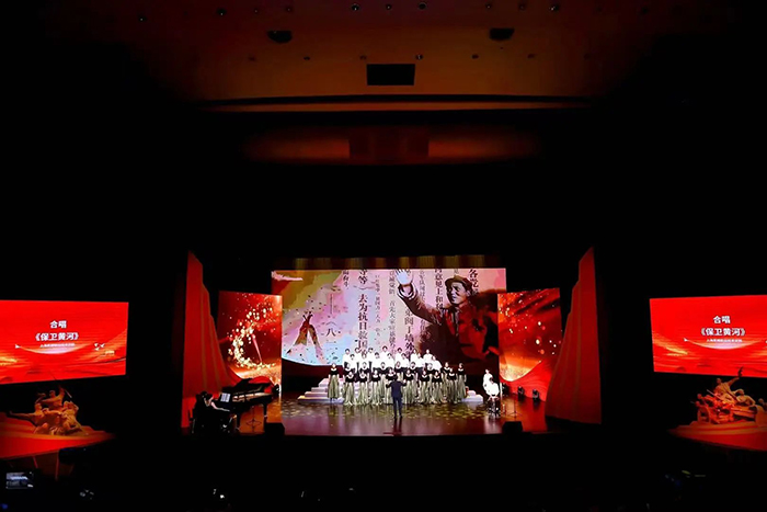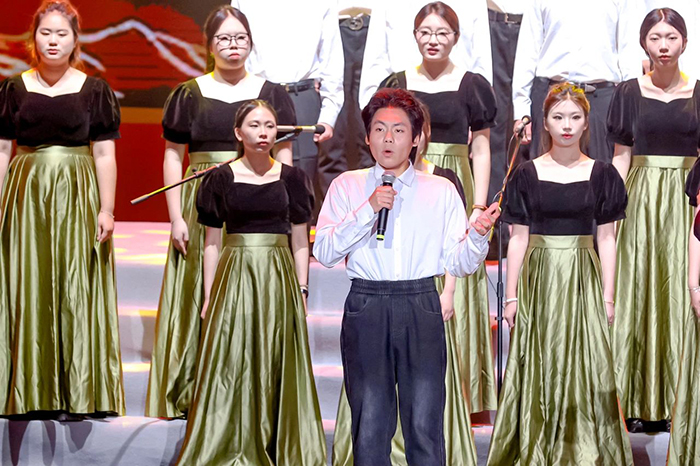 演出时,师生们以饱满的热情、铿锵的旋律,生动展现了抗日战争时期中国人民浴血奋战、顽强不屈夺取胜利的壮阔历史。激昂的歌声不仅诉说着往昔的峥嵘岁月,更传递出在党旗引领下,新时代中华儿女团结奋进、勇毅前行的坚定信念与昂扬风貌,引发全场观众的强烈共鸣。