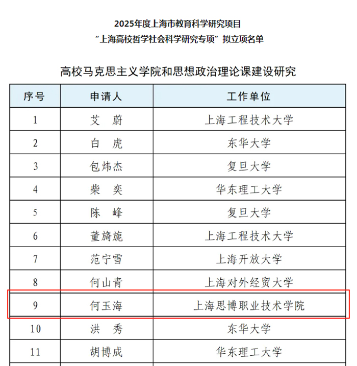 近日,中共上海市教育卫生工作委员会、上海市教育委员会公布了2025年度上海市教育科学研究项目“上海高校哲学社会科学研究专项”立项名单,我校马克思主义学院院长何玉海教授申报的课题在“高校马克思主义学院和思想政治理论课建设研究”项目中成功获批。何玉海教授的这项研究成果,是他学术探索道路上的重要进展,同时是学校在此类课题的一次重要突破,为学校在相关课题研究领域积累了宝贵经验,对后续科研工作的推进具有积极意义。
