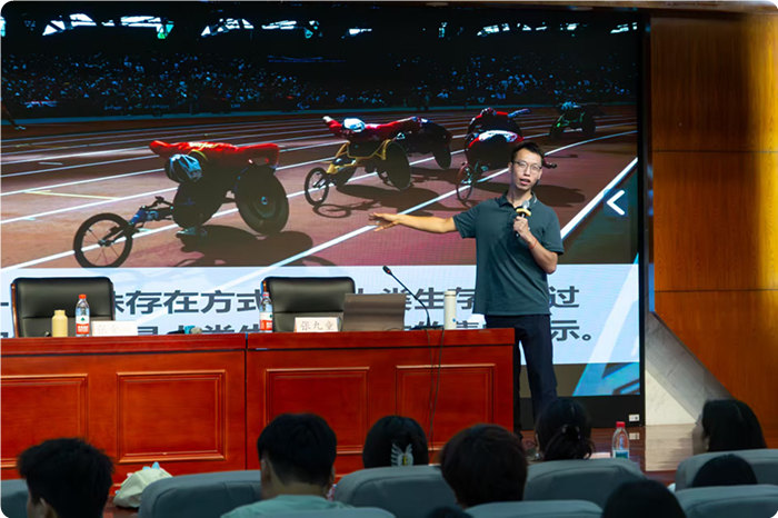 讲座现场,张九童教授以自身如何克服身体残障、追求学业和学术梦想为主线,结合新时代残疾人观与人生哲学,为我校学子们带来了一场生动而热烈的专题讲座。张教授首先向同学们抛出“怎样珍惜来之不易的生命”这一命题,随即围绕“残疾”与“敬畏、珍爱、感恩生命”两大主题展开探讨,提出“残疾并非生命的缺陷,而是人类多样性的一种体现”理念。他进一步呼吁大家打破“健全-残疾”的二元对立思维,转向“赋能互助、共同成长”的融合视角,并结合自己从融合教育受益者到参与者和奉献者转变的经历,以亲身实践诠释“真正的融合是双向滋养”。