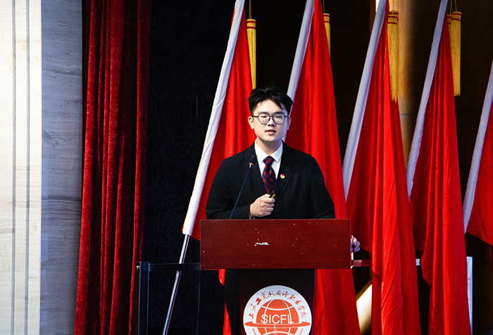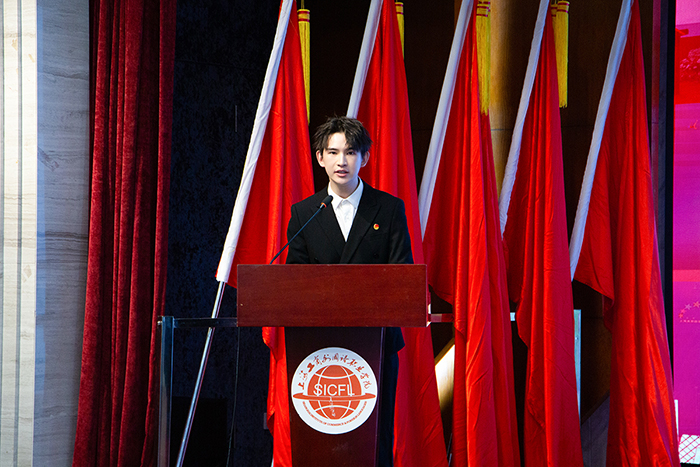 为兼顾评审效率与公平性,本次答辩采用“双场制”模式。上半场首先由上海工商外国语职业学院党委书记万峰致开幕辞,他围绕“以学报国为志,以追求卓越为帆”主题,勉励青年学子将个人成长融入国家发展大局,强调奖学金评选既是荣誉加冕,更是责任传承。随后,前30名候选人依次登台,围绕学业成绩、学生工作、科创竞赛、社会实践、志愿服务等五个方面展开陈述,通过具体数据、成果案例等形式立体呈现综合素质。