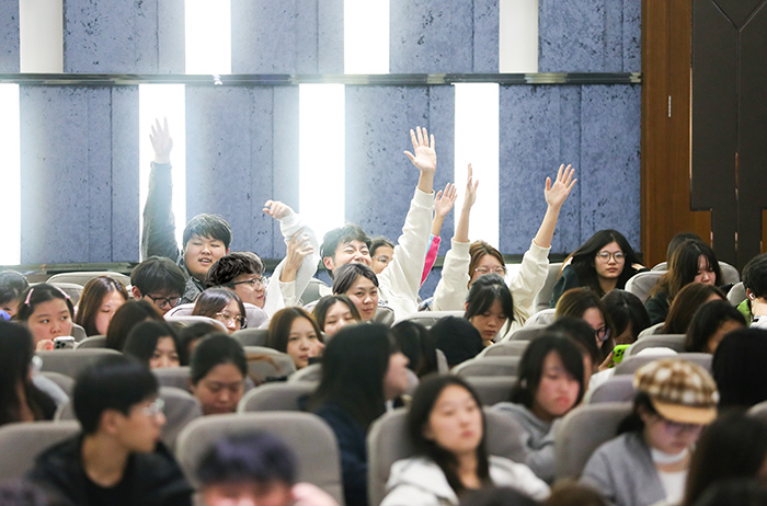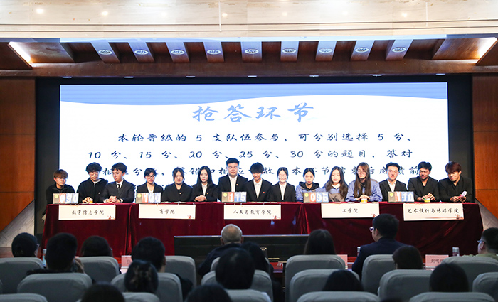 决赛抢答环节将现场氛围推向高潮。五支队伍全神贯注、严阵以待,抢答器声音此起彼伏,每一次抢答都凝聚着团队的智慧与默契。选手们反应敏捷、逻辑清晰,或稳扎稳打,或果断出击,比分交替上升,悬念迭起,现场掌声与惊叹声不断。最终,商学院、人文与教育学院、数字信息学院三支队伍凭借扎实功底与出色发挥,成功挺进法治宣讲环节,赢得全场喝彩。