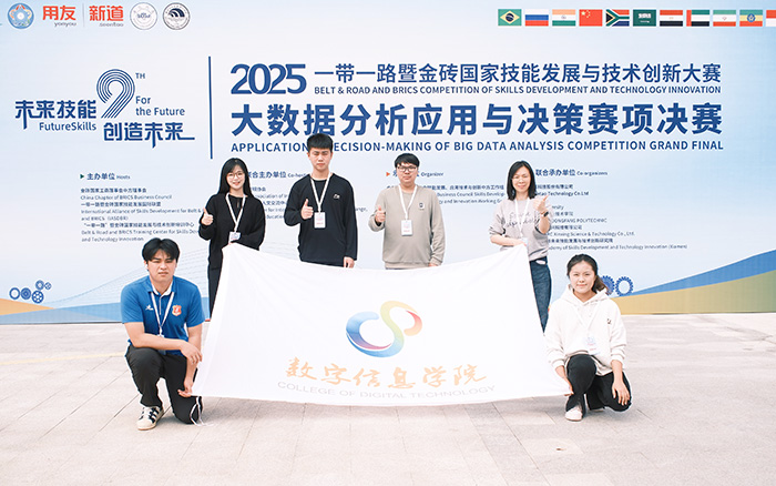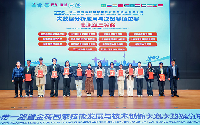 11月8日,2025“一带一路”暨金砖国家技能发展与技术创新大赛“大数据分析应用与决策”赛项全国总决赛在线上及浙江温州同步举行。我校数字信息学院学生高航、简永之、王博文、范文欣组成的参赛团队在指导老师王宇翔、王佳丽的带领下,与全国105支晋级战队同台竞技,凭借扎实的专业功底与出色的实践能力,荣获该赛项全国三等奖,充分展现了我校学子出色的综合素养与昂扬的青春风采。