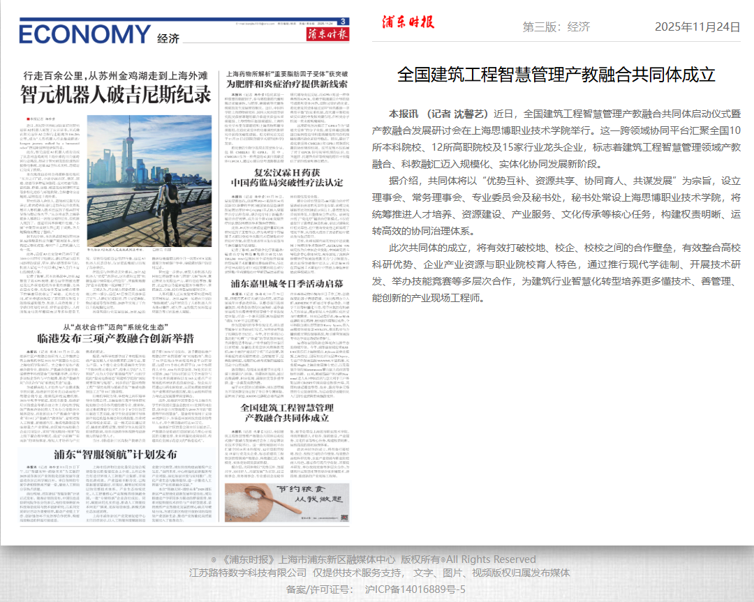 本报讯(记者沈馨艺)近日,全国建筑工程智慧管理产教融合共同体启动仪式暨产教融合发展研讨会在上海思博职业技术学院举行。这一跨领域协同平台汇聚全国10所本科院校、12所高职院校及15家行业龙头企业,标志着建筑工程智慧管理领域产教融合、科教融汇迈入规模化、实体化协同发展新阶段。