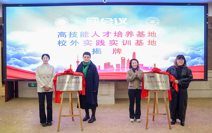 在与会嘉宾的共同见证下,现场同步揭牌数字会展产业学院、产教融合实训基地数字会展实验室、高技能人才培养基地及校外实践实训基地。