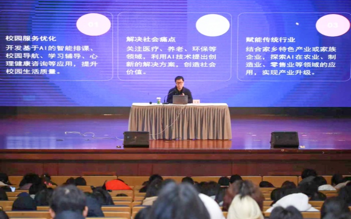 刘睿教授结合当前人工智能发展前沿趋势,聚焦人工智能在医疗健康、乡村振兴等领域的创新应用,通过具体案例展示了人工智能赋能创新创业的现实成效,更引导青年学生在主动拥抱科技创新的同时,强化社会责任感与使命担当。