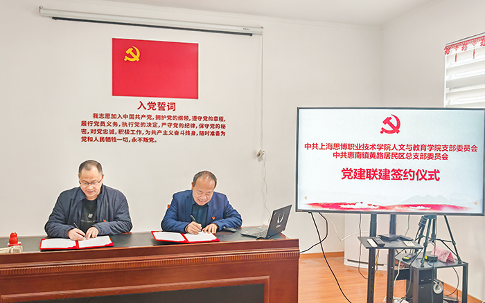 为深入学习贯彻党的二十大精神与习近平新时代中国特色社会主义思想,扎实推进新时代党的建设总要求落地见效,深化校社协同育人机制,12月17日,中共上海思博职业技术学院人文与教育学院支部委员会与中共惠南镇黄路居民区总支部委员会举行结对共建签约仪式。我校人文与教育学院党支部书记、院长张金福教授,副书记、副院长卢小希老师,支部组织委员潘利利老师,支部宣传委员、院办主任邵嬿娜老师,以及法律专业教师代表马文婷老师、学前教育专业教师代表朱元元老师一行前往黄路居委,与黄路居委书记唐勇,两委委员毛怿名,居委支委沈波、朱欢,居委委员瞿霞等共同出席签约仪式,见证校社党建共建开启新篇章。