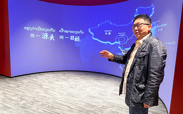 代表团首先参观了展馆,场馆负责人周拯宇详细介绍了老挝的国家概况、两国合作的历史脉络和合作模式。作为老挝在海外设立的首个综合性国家级展馆,老挝馆通过“秘境老挝”“友谊长存”“硕果累累”“多边共赢”四大展厅,全面展示老挝国家形象、中老深厚友谊以及双方在政治、经贸、文化、旅游等领域的丰硕合作成果。目前,该场馆已成为两国增进了解和交流的重要平台。