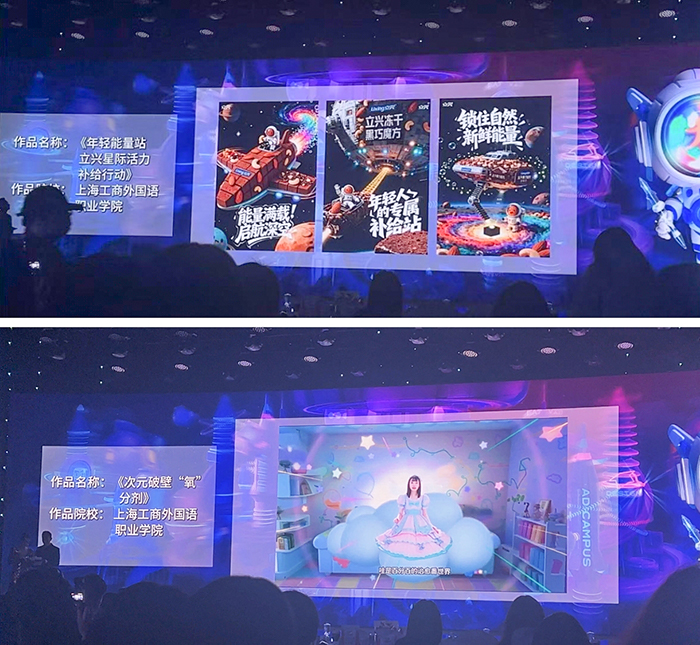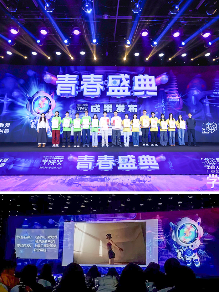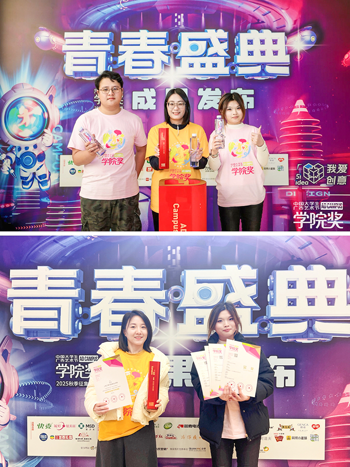 12月28日,中国大学生广告艺术节学院奖2025秋季赛创意盛典在北京广播大厦举行。在这场汇聚全国1830所高校5309个院系创意力量的顶级赛事中,我校徐悲鸿艺术学院温斯宇、储君毅同学终审入围三件作品,最终获得2金1铜的优异成绩,尽显青年设计力量与教学育人成效。王玉、朱奕娇两位教师被授予“金级类指导老师”荣誉称号。