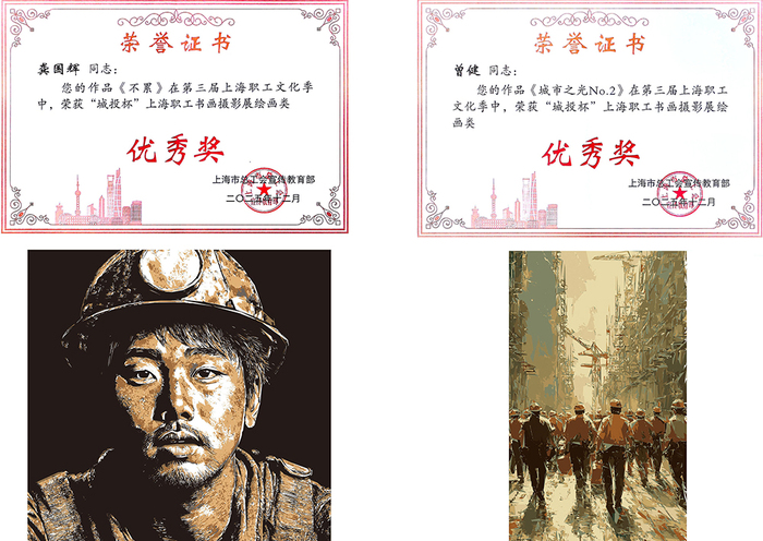 近期,在上海市总工会宣传教育部2026年1月8日公布的第三届上海职工文化季“城投杯”上海职工书画摄影展中,龚国辉作品《不累》、曾健作品《城市之光No.2》双双荣获绘画类优秀奖,展现了扎实的艺术功底与持续的创作活力,为学校赢得了荣誉。