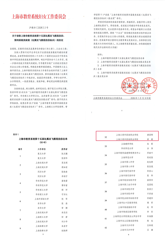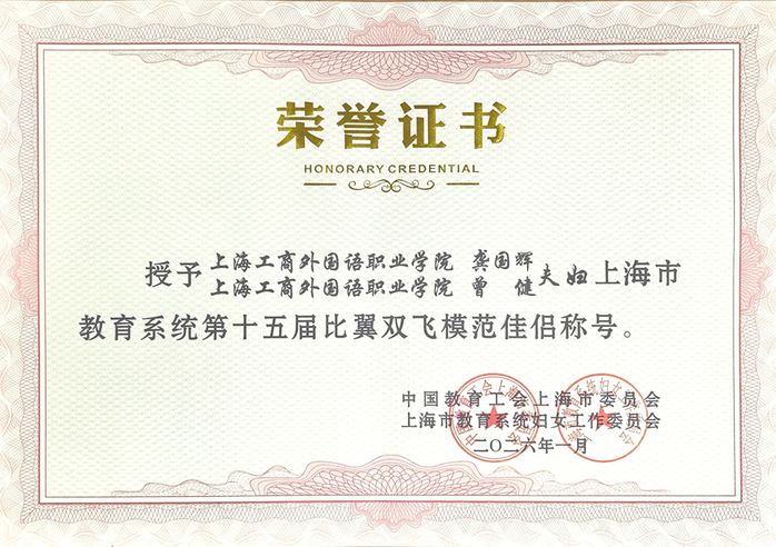 龚国辉、曾健夫妇荣获上海市教育系统第十五届比翼双飞模范佳侣称号